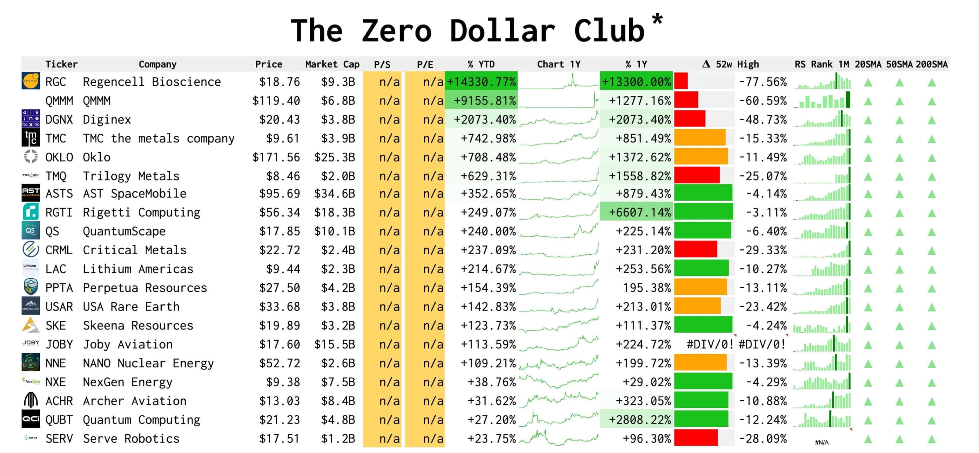 Tabelul „Zero Dollar Club” surprinde esența unei distorsiuni post-pandemice: companii cu capitalizări între $1–25 mld. și venituri aproape inexistente au înregistrat creșteri explozive, de ordinul a +14.330% (Regencell Bioscience), +9.155% (QMMM) sau +6.607% (Rigetti Computing). Acțiuni populare ca OKLO, ASTS, NNE..