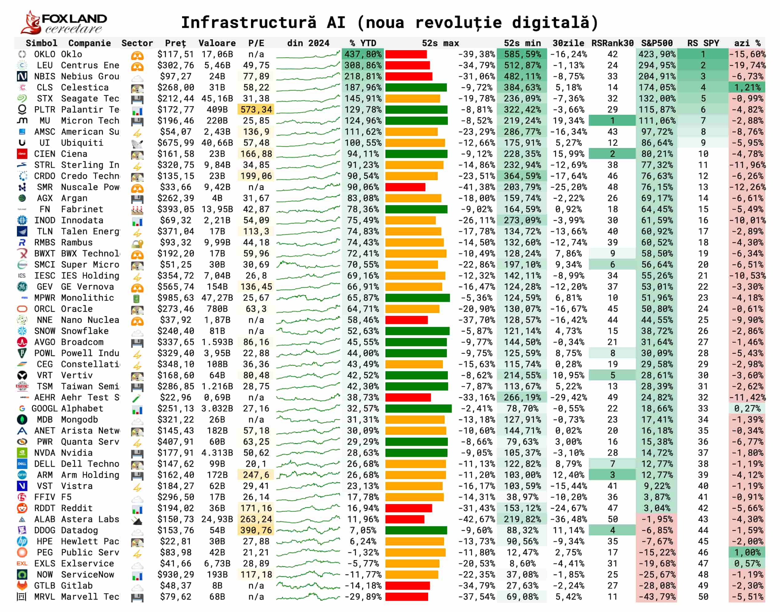 În astfel de momente, investitorul matur distinge între corecție tehnică și deteriorare fundamentală. Majoritatea companiilor din listă rămân cu trenduri ascendente pe 12 luni, marje în expansiune și vizibilitate strategică în lanțurile AI globale. Pe termen scurt, însă, presiunea de vânzare indicată în coloana „azi %” reflectă realizarea de profituri și ajustarea portofoliilor înaintea sezonului de raportări. Consolidările bruște într-un sector supra-extins statistic sunt adesea începutul următoarei etape de leadership, în care jucătorii cu fundamente reale – energie, infrastructură, semiconductori – continuă să domine ciclul structural al inteligenței artificiale.